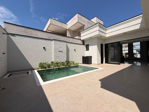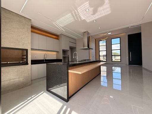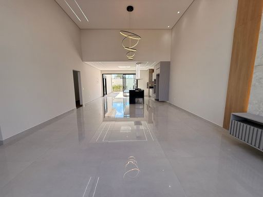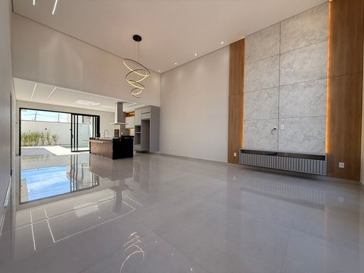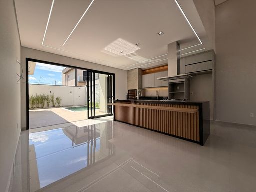 A residência possui arquitetura contemporânea, pé-direito alto na área social e ambientes integrados, proporcionando amplitude e boa iluminação natural. A sala de estar e jantar se conectam com a cozinha e com a área externa, onde ficam a piscina e o espaço de convivência.
