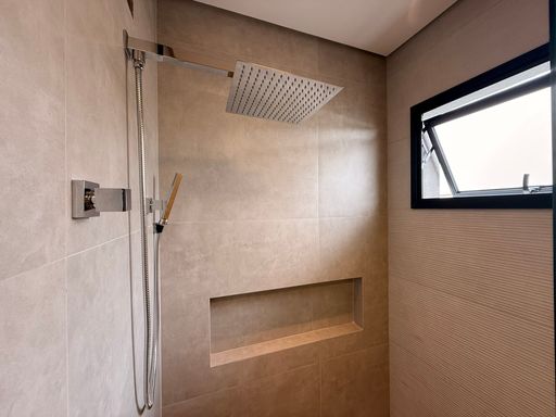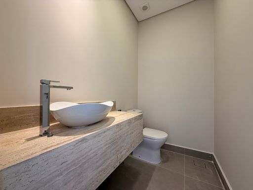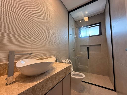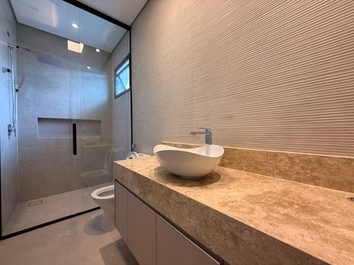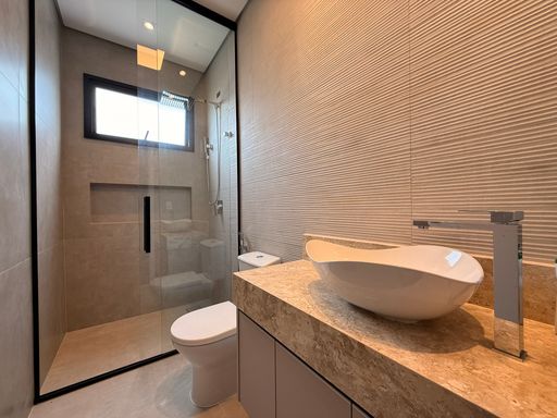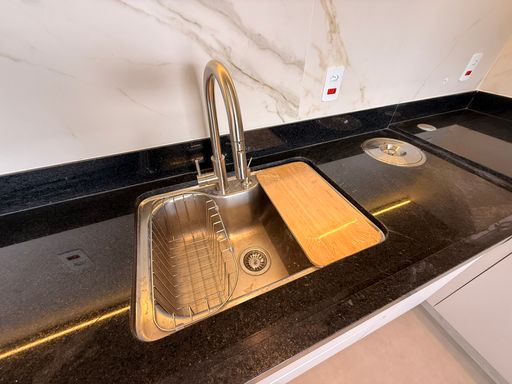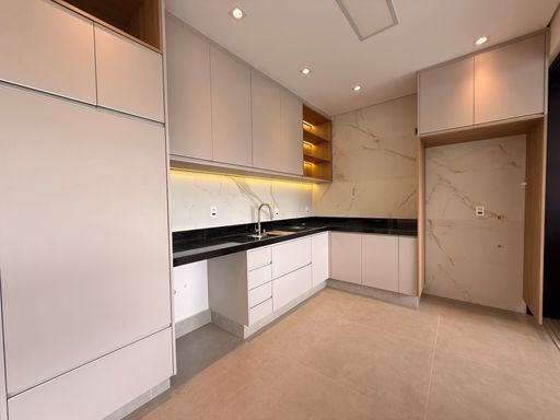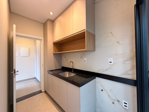 A cozinha é integrada à área gourmet, com possibilidade de fechamento através de esquadria, oferecendo versatilidade para o dia a dia ou para receber convidados. Conta ainda com despensa funcional e área de serviço reservada.